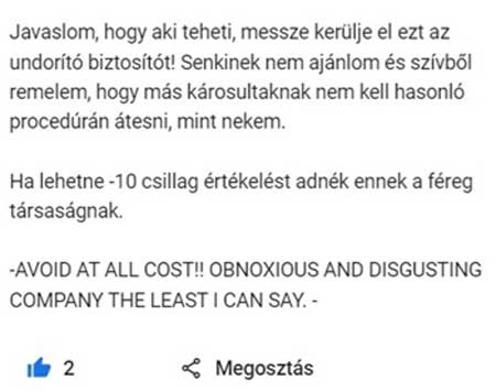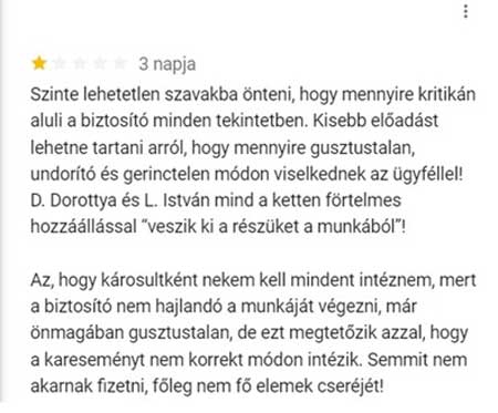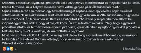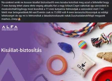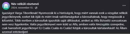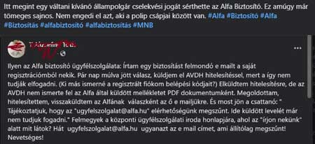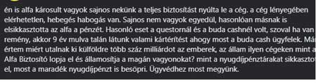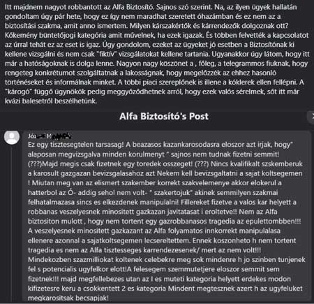 „Azonban fontos megemlíteni, hogy az Alfa Biztosító berkein belül nem csak a nem-életbiztosítási, illetve felelősségbiztosítási szegmensben vannak visszaélések, hanem az életbiztosítási üzletágban is. Mellékletben küldünk néhány képernyőfotót, amiket az Alfa Károsult Facebook Csoportból mazsoláztunk ki, vagy amiket megküldtek nekünk.