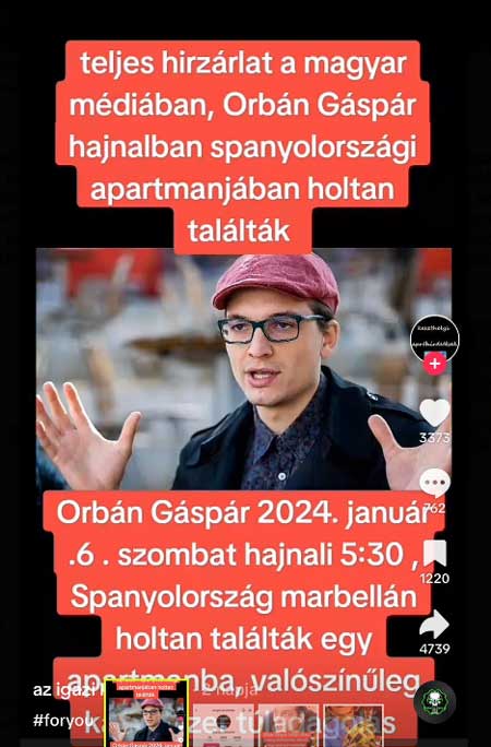 Egy TikTok-felhasználó bejegyzése nyomán kapott szárnyra a pletyka: január 6-án, reggel, Marbella városában, kábítószer-túladagolás következtében meghalt Orbán Viktor miniszterelnök fia, a 32 éves Orbán Gáspár. Az „információ” a Facebookon is terjedni kezdett.