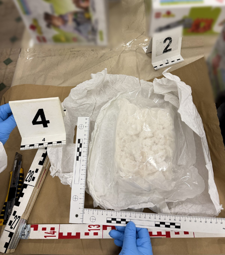 A bűnügyesek a gyerekjátékdobozok felbontását követően több mint 12 kilogramm droggyanús anyagot találtak, amiben a gyorsteszt kristályt és kokaint mutatott ki. Az anyag lefoglalásával a rendőrök több mint 25 ezer adag kábítószer forgalomba kerülését akadályozták meg, amelynek feketepiaci értéke meghaladja a 106 millió forintot.