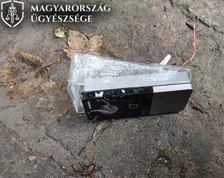 Korábban olyan is előfordult, hogy a fiatalkorú vádlott az utcán sétált, amikor is az egyik ingatlan videós kaputelefonját letépte, majd azt az ingatlan területére bedobta (fotónkon). Ezzel a vádlott közel 100 000 forint kárt okozott.