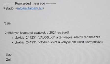 Ami biztos: a Vital Park Kft. 2024. évi beszámolója a „kozmetikázott” főkönyvi kivonat számadatait tartalmazza, tehát a társaság könyvelője az általa „megpiszkált”, valótlanságokat is tartalmazó kivonat alapján készíthette el a mérleget, amit Vámos aláírt és intézkedett annak közzétételéről.