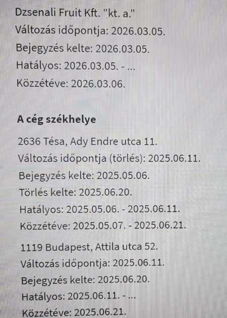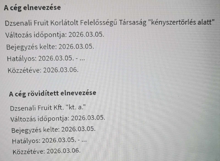A Dzsenali Fruit Kft.-t 2025. április 29-én alapították. „Tulajdonos-ügyvezetője” egy 29 éves, Kántorjánoson élő nő, Lakatos Vivien. A számlagyártó cég már a kukában van, a NAV törölte az adószámát, az illetékes cégbíróság pedig - 2026. március 5-én - elrendelte a kényszertörlését.