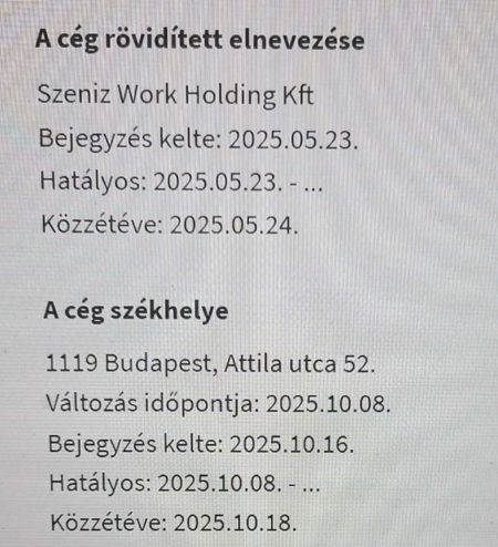 A sorban a következő a Szeniz Work Holding Kft., amely egy hónappal később, 2025. május 20-án alakult. A „tulajdonos-ügyvezetőt” Lakatos Zoltánnak hívják. A férfi 21 éves, Hodászon él. Ez a kft. még létezik (papíron), de valószínűleg már passzívba fordították, kivették a cégláncolatból és a cégbírósági kényszertörlésre vár.