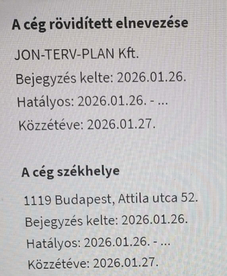 Kilenc nappal később, 2026. január 22-én a 33 éves Jónás Teréz nevével készültek a következő társaság, a JON-TERV-PLAN Kft. iratai a budapesti ügyvédi irodában. Talán már nem meglepő: a hölgy is nyírkátai lakos.