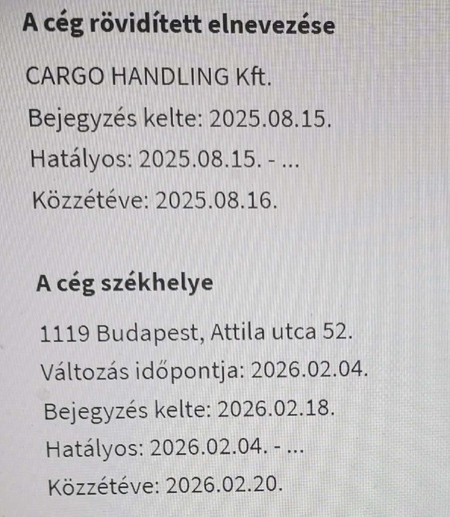 Az előző társaság létrehozása óta nem egészen 3 hónap telt el, amikor - 2025. augusztus 12-én - bejegyeztették az újabb csaló céget, a CARGO HANDLING Kft.-t. Ebben a vállalkozásban 33 éves, Mátészalkán élő Jónás Erika vállalta a „tulajdonos-ügyvezetői” szerep alakítását, és azzal együtt a többéves szabadságvesztés lehetőségét.
