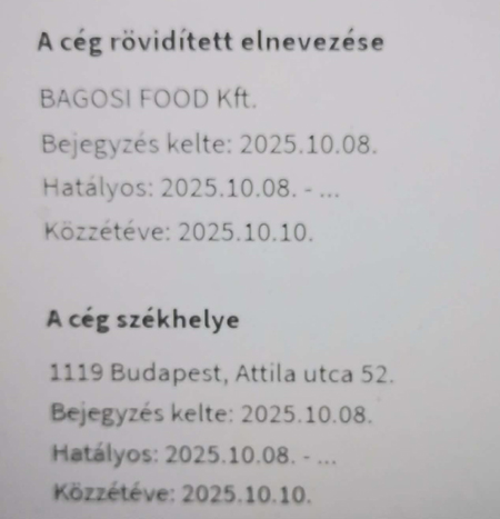 Bő egy hónap elteltével, 2025. október 3-án már új kft. papírjait szerkesztgette az ügyvéd - aki egyébként mind a nyolc cég alapításában közreműködött -, ez volt a BAGOSI FOOD Kft. Ebben az úgynevezett vállalkozásban szintén egy nyírkátai lakos, a 41 éves Rézmüves Jánosné kapta meg az esélyt arra, hogy „tulajdonos-ügyvezetőként” esetleg felkapják a NAV bűnügyesei.